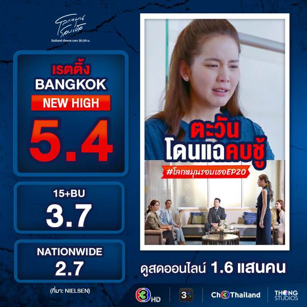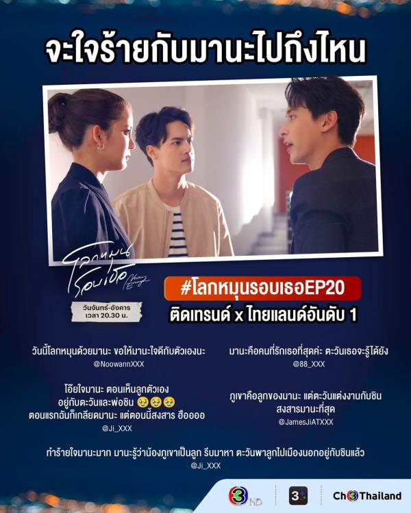 กระแสมาแรงสุด ๆ ถึงขั้นพาแฮชแท็ก #โลกหมุนรอบเธอEP19 และ #โลกหมุนรอบเธอEP20 ทะยานขึ้นอันดับ 1 เทรนด์ X ประเทศไทย และในส่วนของเรตติ้งก็มาแรงไม่แพ้กัน ซึ่ง “โลกหมุนรอบเธอ ep.20” คว้าเรตติ้งกลุ่มผู้ชมกรุงเทพฯ นิวไฮถึง 5.4 เรตติ้งกลุ่มผู้ชมอายุ 15 ปี ขึ้นไป หรือ กลุ่ม 15 BU+ (Bangkok and Urban) คว้าไป 3.7 และเรตติ้งทั่วประเทศอยู่ที่ 2.7