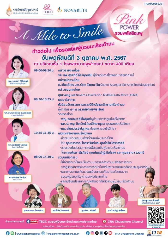 ‘Pink Power’ รวมพลังสีชมพูในกิจกรรม A Mile to Smile ก้าวต่อไปเพื่อรอยยิ้มของผู้ป่วยมะเร็งเต้านม 3 ตุลาคม 2567 เวลา 9:00 น. (ลงทะเบียนได้ตั้งแต่ 8.00 น.) ณ ชั้น 1 อาคารโรงพยาบาลจุฬาภรณ์ 400 เตียง