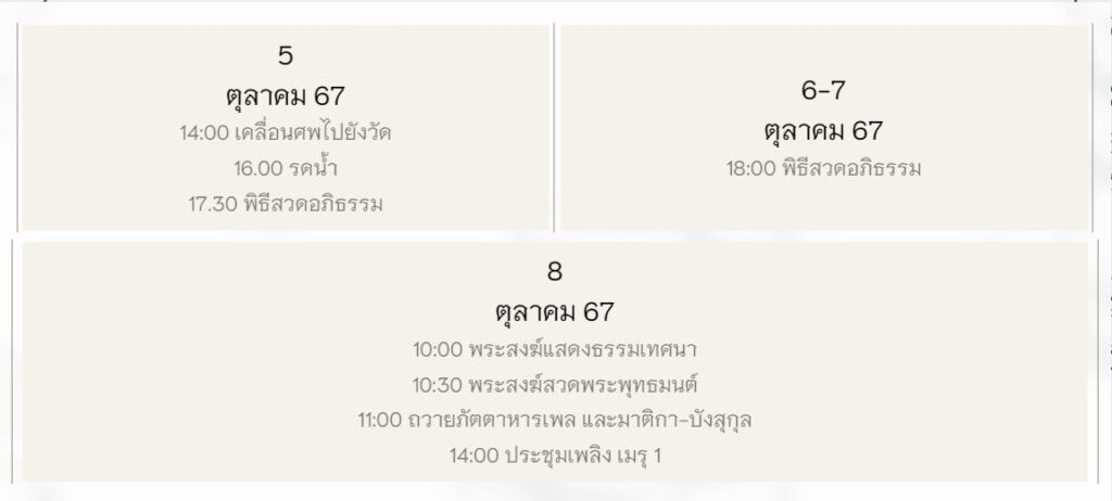ส่วนพิธีสวดอภิธรรม จัดขึ้นในวันที่ 5-7 ตุลาคม 2567 เวลา 18.00 น. ที่วัดพระศรีมหาธาตุ วรวิหาร ศาลา 3 และจะมีพิธีฌาปณกิจ ในวันที่ 8 ตุลาคม 2567 เวลา 14.00 น.
