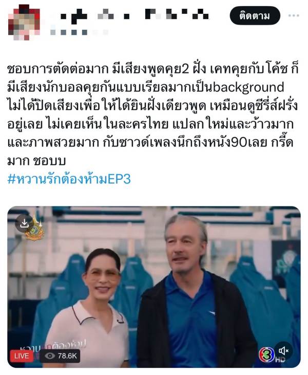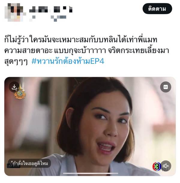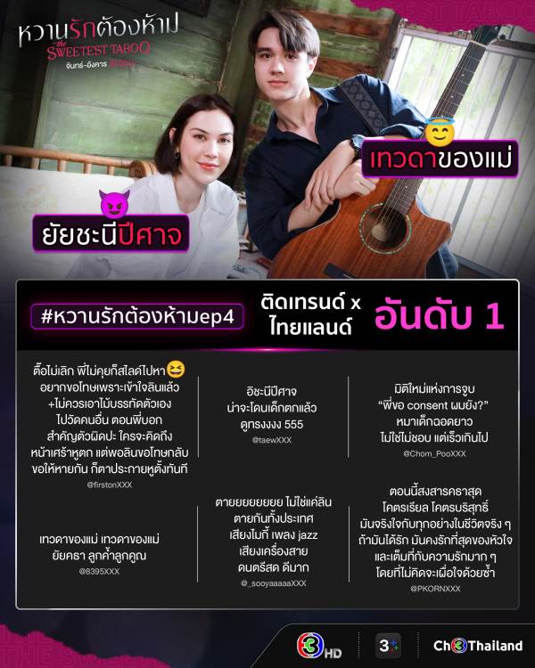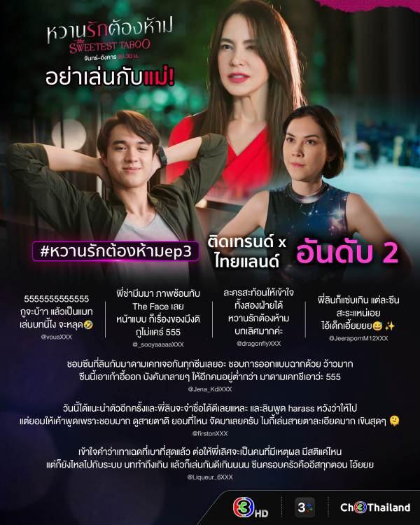 จี๊ดจ๊าดสมเป็นละครตัวแม่ ตัวมัมสุด ๆ สำหรับละครเรื่อง “หวานรักต้องห้าม” ทางช่อง 3 ถือว่าสมการรอคอยการคัมแบคละครในรอบ 5 ปีของ แมท ภีรนีย์ ร่วมกับพระเอกหน้าหวาน ไมกี้ ปณิธาน และตัวแม่ มาช่า วัฒนพานิช ที่เปิดศึกสาดอารมณ์ถึงใจถูกใจชาวเน็ตจนทำแฮชแท็ก #หวานรักต้องห้ามEP3 ติดเทรนด์ X ไทยแลนด์อันดับ 2 ทำคนดูอารมณ์ค้างไม่จบง่าย ๆ ตามไปปั่นแฮชแท็ก #หวานรักต้องห้ามEP4 พุ่งติดเทรนด์ X ไทยแลนด์อันดับ 1 กันเลยทีเดียว