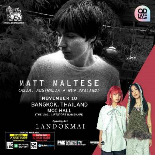 พบกับ MATT MALTESE “Touring Just To Tour 2024” Live In Bangkok วันอาทิตย์ที่ 10 พฤศจิกายน 2567 นี้ ณ MCC Hall The Mall life store บางกะปิ ประตูเปิด :18.30 น บัตรราคา 2,500 ฿ ซื้อบัตรได้ที่ : Ticketmelon
