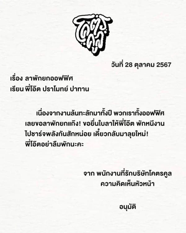 อย่างชอบเลย เมื่อพนักงาน บริษัทโคตรคูล ของ โอ๊ต ปราโมทย์ ที่ล่าสุดส่งจดหมาย ไปถึง พี่โอ๊ต ไว้ว่า “เรื่อง ลาพักยกออฟฟิศ เนื่องจากงานล้นทะลักมาทั้งปี พวกเราทั้งออฟฟิศเลยขอลาพักยกแก๊ง! ขอยื่นใบลาให้พี่โอ๊ต พักหนีงานไปชาร์จพลังกันสักหน่อย เดี๋ยวกลับมาลุยใหม่! พี่โอ๊ต อย่าลืมพักนะ