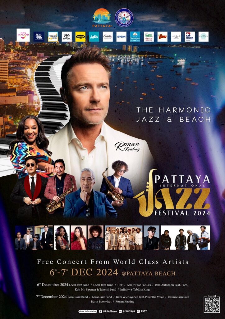 กลับมาอีกครั้งอย่างยิ่งใหญ่ “Pattaya International Jazz Festival 2024” “เมืองพัทยา” นำเสนอศิลปินระดับโลก Ronan Keating พลาดไม่ได้ 6 – 7 ธันวาคม 2567 ณ ริมชายหาดพัทยากลาง จ.ชลบุรี
