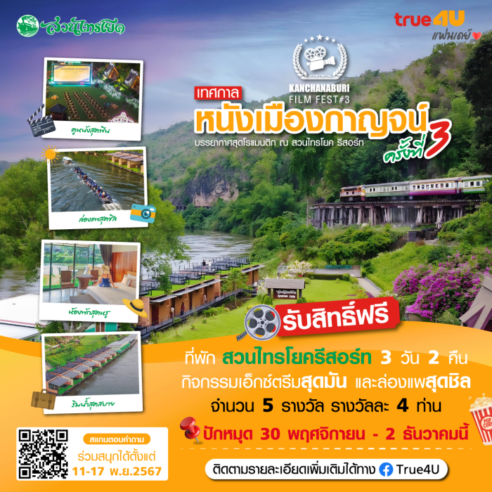 วันนี้ขอเอาใจคนรักหนังที่ชื่นชอบบรรยากาศธรรมชาติสวย ๆ True4U แฟนเดย์มีกิจกรรมพิเศษมาฝาก กับเทศกาลหนังเมืองกาญจน์ ครั้งที่ 3 ท่ามกลางบรรยากาศสุดโรแมนติกที่มีหนังครบทุกรสชาติให้ชมกันอย่างเต็มอิ่ม พร้อมรับสิทธิ์พักฟรีที่สวนไทรโยครีสอร์ท ห้องแฟมิลี่ 3 วัน 2 คืน รวมถึงกิจกรรมเอ็กซ์ตรีมสุดมันและล่องแพสุดชิล จำนวน 5 รางวัล ๆ ละ 4 ท่าน ระหว่างวันที่ 30 พฤศจิกายน – 2 ธันวาคม 2567 ขับรถไปเที่ยวกันเลย ร่วมสนุกง่าย ๆ เพียงสแกน QR CODE หรือกดลิ้งค์ https://forms.gle/RgBBtK5FcKr8pjzL9 พร้อมตอบคำถามและทำตามกติกาครบถ้วน ก็มีสิทธิ์ลุ้นเป็นผู้โชคดี อย่าลืมมาร่วมสนุกกันตั้งแต่วันที่ 11-17 พฤศจิกายน 2567 ประกาศรายชื่อผู้โชคดีวันที่ 18 พฤศจิกายน 2567 ทางเฟซบุ๊ก True4U
