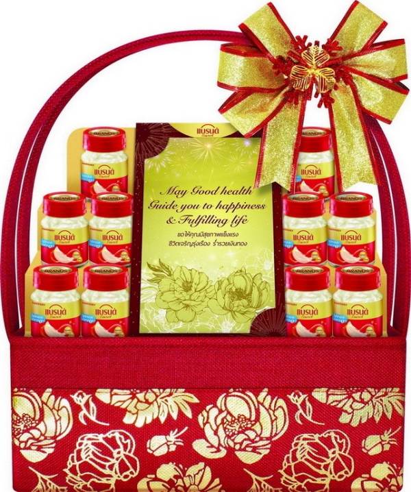 - กระเช้าแบรนด์รังนกแท้ เปลี่ยนเป็น “ตะกร้าใส่ของ” ลวดลายดอกโบตั๋น เรียบหรู ออกแบบโดย Janfive Studio มีให้เลือก 2 แบบ ได้แก่ กระเช้าแบรนด์รังนกแท้ สูตรไซลิทอล ไม่มีน้ำตาล ขนาด 42 มล. จำนวน 10 ขวด ราคา 1,099 บาท และ กระเช้าแบรนด์รังนกแท้ สูตรคลาสสิก น้ำตาลกรวด ขนาด 42 มล. จำนวน 10 ขวด ราคา 1,099 บาท