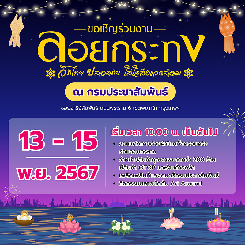 เชิญร่วมงานสืบสานวัฒนธรรมไทย ร่วมใจลอยกระทง ประจำปี 2567 วันที่ 13-15 พฤศจิกายน 2567 ตั้งแต่เวลา 10.00 น. เป็นต้นไป ณ กรมประชาสัมพันธ์ ซอยอารีย์สัมพันธ์ ถนนพระราม 6 เขตพญาไท กรุงเทพฯ