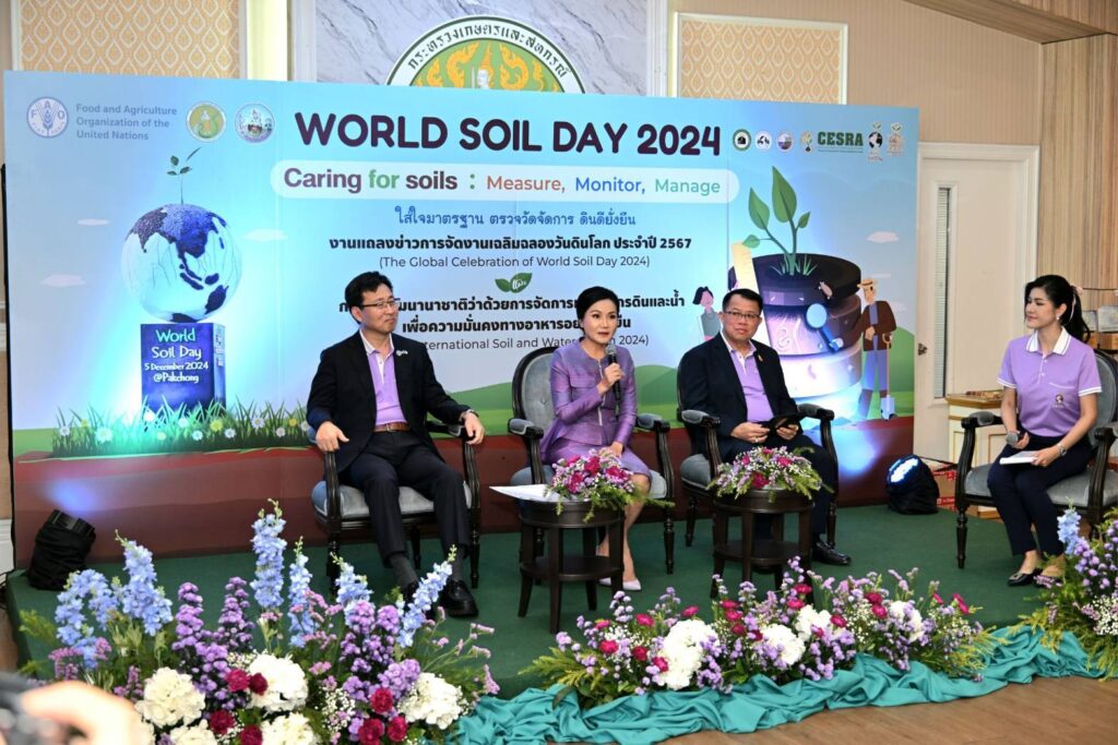 วันอังคารที่ 19 พฤศจิกายน 2567 ศ.ดร.นฤมล ภิญโญสินวัฒน์ รัฐมนตรีว่าการกระทรวงเกษตรและสหกรณ์ เป็นประธานการแถลงข่าวการจัดงานเฉลิมฉลองวันดินโลก ประจำปี 2567 (The Global Celebration of World Soil Day 2024) ในหัวข้อ “Caring for soils: measure, monitor, manage” ใส่ใจมาตรฐาน ตรวจวัดจัดการ ดินดียั่งยืน และการประชุมนานาชาติว่าด้วยการจัดการทรัพยากรดินและน้ำ เพื่อความมั่นคงทางอาหารอย่างยั่งยืน (The International Soil and Water Forum 2024) โดยมี นายอิทธิ ศิริลัทธยากร รัฐมนตรีช่วยว่าการกระทรวงเกษตรและสหกรณ์ นายอัครา พรหมเผ่า รัฐมนตรีช่วยว่าการกระทรวงเกษตรและสหกรณ์ Mr. Jong Jin Kim ผู้ช่วยผู้อำนวยการใหญ่ FAO นายประยูร อินสกุล ปลัดกระทรวงเกษตรและสหกรณ์ ผู้บริหารกระทรวงเกษตรและสหกรณ์ ดร.ทวีศักดิ์ ธนเดโชพล อธิบดีกรมพัฒนาที่ดิน ดร.อาทิตย์ ศุขเกษม รองอธิบดีกรมพัฒนาที่ดิน ดร.สุมิตรา วัฒนา รองอธิบดีกรมพัฒนาที่ดิน และผู้บริหารกรมพัฒนาที่ดิน เข้าร่วม ณ ห้องประชุม 115 กระทรวงเกษตรและสหกรณ์ กรุงเทพฯ
