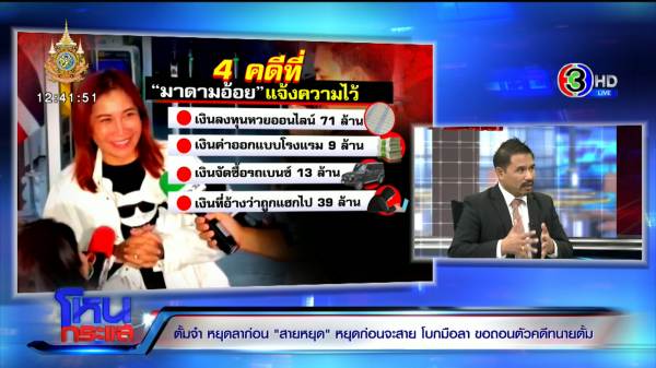 สายหยุด : เบ็ดเสร็จแทบเกือบร้อยแล้ว ผมบอกถ้าพี่จะยืนยันความบริสุทธิ์ พี่คืนทรัพย์สินได้ในทางแพ่ง ทางอาญาพี่ก็สู้ไป อย่างน้อยแพ้ก็มีเหตุบรรเทาโทษ ชนะตัวเองก็หล่อ ไม่โกง แต่เมื่อเจ้าหนี้เขาทวงก็ต้องคืน อีกหน่อยเขาฟ้องให้โดยเสน่หา เขาเรียกคืนได้ถือว่าเนรคุณ ใช่มั้ยครับ ทางแพ่งก็ยังไม่จบ ถึงคุณชนะอาญา แพ่งก็ไม่จบ เพราะเขาพูดว่าเขาไม่เคยให้ ก็เนี่ยแหละ เริ่มเห็นไม่ตรงกับผม กับพี่โจ้