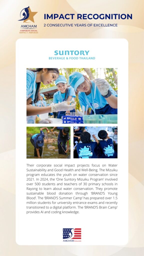 นางมธุวลี สถิตยุทธการ ผู้อำนวยการฝ่ายรัฐกิจและองค์กรสัมพันธ์ บริษัท ซันโทรี่ เบเวอเรจ แอนด์ ฟู้ด (ประเทศไทย) จำกัด กล่าวว่า “การได้รับรางวัล AMCHAM Corporate Social Impact Award ครั้งนี้ สะท้อนถึงความมุ่งมั่นของบริษัทฯ ในการสร้างคุณค่าให้แก่สังคมและสิ่งแวดล้อม โดยในปีนี้ เราเน้นสร้างจิตสำนึกด้านการอนุรักษ์น้ำให้กับเยาวชนไทย ภายใต้โครงการ “วัน ซันโทรี่ มิซุอิกุ: เรารักษ์น้ำ 2567” (One Suntory Mizuiku Program 2024) ผ่านกิจกรรมภายใต้ห้องเรียนธรรมชาติ หรือ Nature Classroom ที่มอบการเรียนรู้จากประสบการณ์จริง เพื่อให้เยาวชนสามารถนำองค์ความรู้ไปปรับใช้ได้ตามบริบทของแต่ละชุมชน และการส่งเสริมการบูรณาการการอนุรักษ์น้ำในโรงเรียน ผ่านการดำเนินโครงการอนุรักษ์น้ำที่ครอบคลุม 4 ด้าน ได้แก่ ด้านนโยบาย การมีส่วนร่วมของบุคลากร การพัฒนาโครงสร้างพื้นฐาน และการขยายผลสู่ชุมชนโดยรอบ โดยเรามุ่งสร้างจิตสำนึกด้านการรับผิดชอบต่อสังคม และสนับสนุนให้เยาวชนเป็น ‘ผู้นำการเปลี่ยนแปลง’ ที่จะกระตุ้นให้เกิดการปรับเปลี่ยนพฤติกรรมด้านการปกป้องรักษาน้ำ และผลักดันการอนุรักษ์ทรัพยากรน้ำในชุมชนอย่างยั่งยืนต่อไป