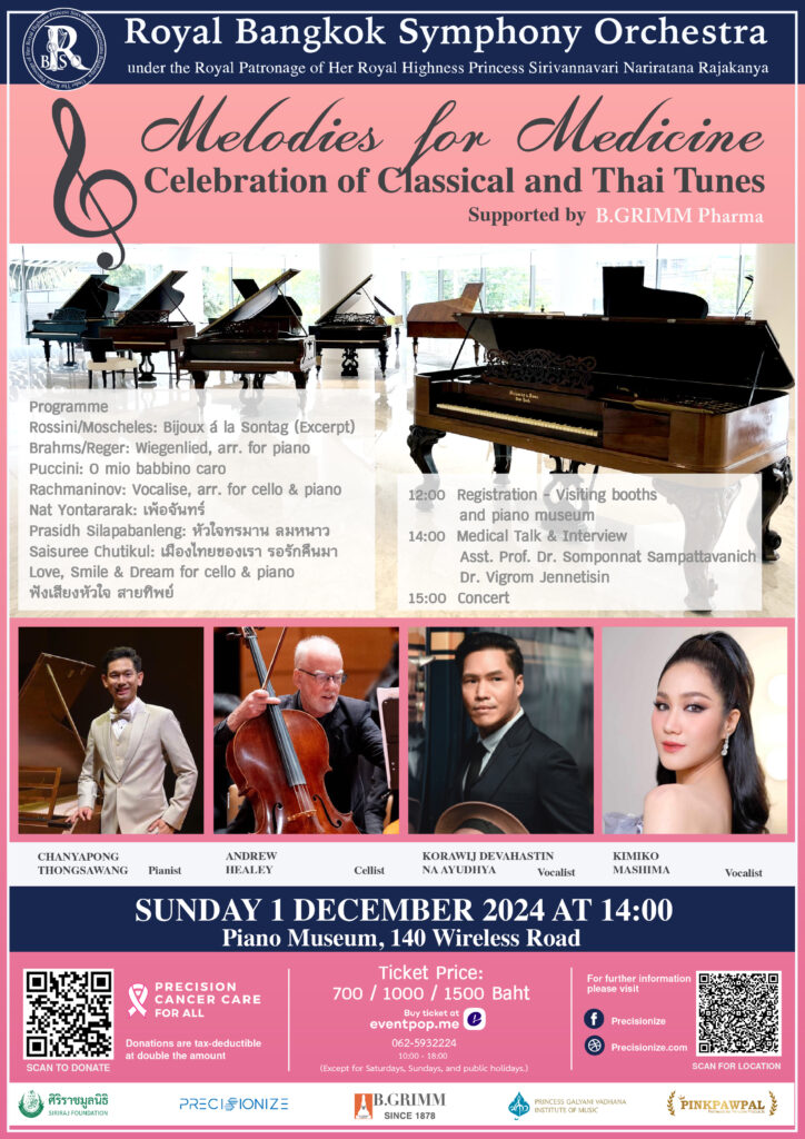 เสียงทำนองร้องรักษา มูลนิธิรอยัลแบงค์คอกซิมโฟนีออร์เคสตร้า ในพระอุปถัมภ์สมเด็จพระเจ้าลูกเธอ เจ้าฟ้าสิริวัณณวรี นารีรัตนราชกัญญา ร่วมกับ บี.กริม ฟาร์มา และเครือข่ายผู้สนับสนุนเพื่อการรักษามะเร็งอย่างแม่นยำ Precision Cancer Care นำโดย บจก. Precisionize ภูมิใจนำเสนอ “เสียงทำนองร้องรักษา: ร่วมใจเพื่อการแพทย์แม่นยำ” งานพิเศษที่ผสมผสานการเสวนาทางการแพทย์ว่าด้วยการป้องกันและรักษามะเร็ง ควบคู่ไปกับการแสดงดนตรี ที่ถูกออกแบบมา เพื่อสร้างแรงบันดาลใจ และกำลังใจให้กับผู้เข้าร่วม โดยงานจะจัดขึ้นในวันอาทิตย์ที่ 1 ธันวาคม 2567 เวลา 14:00 – 16:30 น. ณ อาคารเคี่ยนหงวน เลขที่ 140 ถนนวิทยุ