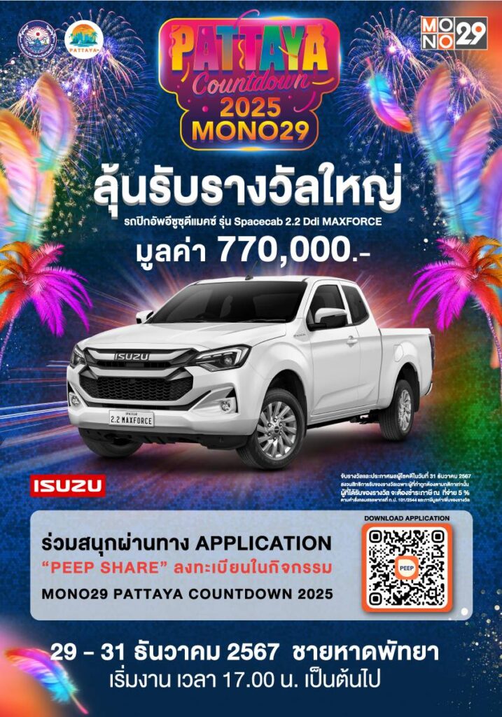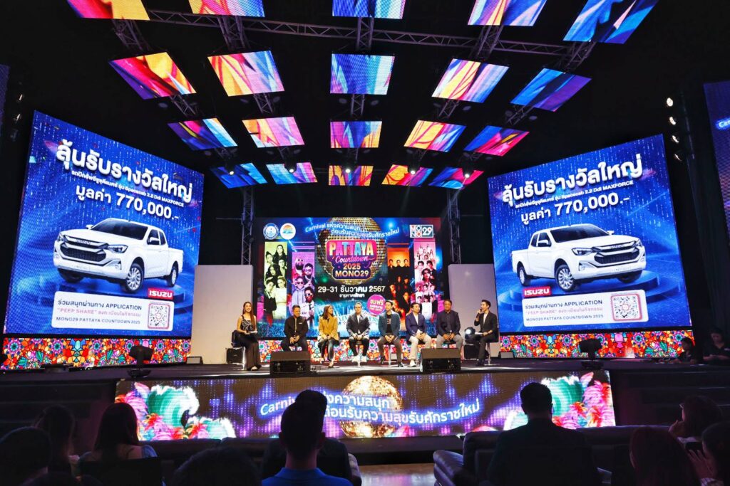 โดยจัดงานแถลงข่าวการจัดงาน “PATTAYA COUNTDOWN 2025” (พัทยาเคาท์ดาวน์ 2025) อย่างเป็นทางการ ณ สเตจ1 โมโน สตูดิโอ ถนนชัยพฤกษ์ จังหวัดนนทบุรี ในวันอังคารที่ 3 ธันวาคม 2567 เวลา 13.30-15.00 น. เริ่มต้นงานเปิดเวทีด้วยโชว์สุดพิเศษ จากตัวแทนศิลปินที่มาร่วมมอบสนุกอย่างครบรสจาก “เป็กกี้ศรีธัญญา” ศิลปินสาวมากความสามารถ ที่ขนทีมแดนเซอร์จัดเต็มความอลังการมาวาดลวดลายความสนุกอุ่นเครื่องบนเวที พร้อมชวนทุก ๆ คน เตรียมตัวไปส่งท้ายปีเก่าต้อนรับปีใหม่ด้วยกัน จากนั้นส่งเวทีต่อให้กับ คณะผู้จัดงาน คุณปรเมศวร์ งามพิเชษฐ์ นายกเมืองพัทยา, คุณวิทยา คุณปลื้ม นายกองค์การบริหารส่วนจังหวัดชลบุรี, คุณชัยวัฒน์ ตามไท ผู้อำนวยการท่องเที่ยวแห่งประเทศไทย สำนักงานพัทยา, คุณบรรณสิทธิ์ รักวงษ์ ประธานเจ้าหน้าที่ปฏิบัติการ บริษัทโมโนเน็กซ์ จำกัด (มหาชน), คุณสรรวรส พุทธเจริญลาภ ผู้จัดการฝ่ายสื่อสารการตลาดรถเล็ก บริษัทตรีเพชร อีซูซุเซลส์ จำกัด และ คุณพงศา นวมครุฑ หัวหน้างานปฎิบัติการธุรกิจบรอดแบนด์ภูมิภาค เอไอเอส สามบีบี ไฟเบอร์ทรี ร่วมพูดคุยถึงการจัดงานเคาท์ดาวน์สุดยิ่งใหญ่ในปีนี้อย่างเป็นทางการ ในการเนรมิตบรรยากาศริมชายหาดพัทยาที่สวยงามให้เต็มไปด้วยสีสันความบันเทิงเต็มรูปแบบ ท่ามกลางการแสดงคอนเสิร์ตสุดมันส์จากศิลปินดังระดับประเทศกว่าร้อยชีวิต และการแสดงพลุไฟสุดยิ่งใหญ่ ตลอด 3 วัน 3 คืน ให้ชาวพัทยาและจังหวัดใกล้เคียงได้เต็มไปด้วยสุขสนุกอย่างไร้ขีดจำกัด ชมฟรีตลอดงาน ถ่ายทอดสดผ่านทางสถานีโทรทัศน์ช่อง MONO29 ในคืนวันที่ 31 ธันวาคม นอกจากนี้ยังมีรางวัลใหญ่ “รถปิกอัพอีซูซุดีแมคซ์รุ่น Spacecab 2.2 Ddi MAXFORCE มูลค่า 770,000 บาท” และของรางวัลอื่นๆ มูลค่ากว่า 1 ล้านบาท ที่ทางผู้จัดงานเตรียมมอบให้เป็นของขวัญปีใหม่ให้กับผู้เข้าร่วมงานได้ร่วมลุ้นอีกด้วย