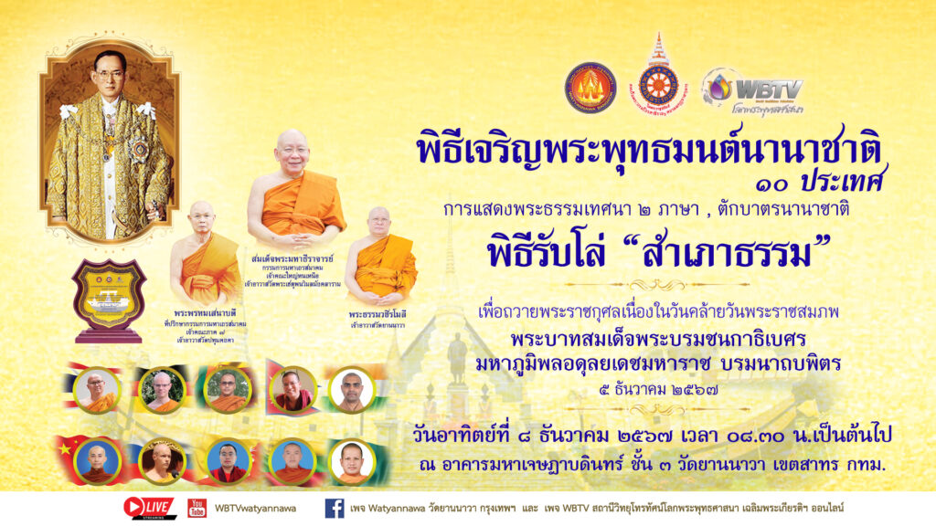 เนื่องในวันคล้ายวันพระบรมราชสมภพ พระบาทสมเด็จพระบรมชนกาธิเบศร มหาภูมิพลอดุลยเดชมหาราช บรมนาถบพิตร คณะสงฆ์ วัดยานนาวา ,สถานีวิทยุโทรทัศน์โลกพระพุทธศาสนาเฉลิมพระเกียรติฯ WBTV ,ภาคีเครือข่าย ตลอดจนพุทธศาสนิกชน ประชาชนที่ศรัทธาต่อพระพุทธศาสนา เทิดทูลสถาบันพระมหากษัตริย์ ก่อเกิดโครงการ“เจริญพระพุทธมนต์นานาชาติ, แสดงพระธรรมเทศนา 2 ภาษา และตักบาตรนานาชาติ” เพื่อน้อมถวายเป็นพระราชกุศล พระบาทสมเด็จพระบรมชนกาธิเบศร มหาภูมิพลอดุลยเดชมหาราช บรมนาถบพิตร เตรียมจัดงานยิ่งใหญ่ถวายพระราชกุศล ในวันอาทิตย์ที่ 8 ธันวาคม 2567 เวลา 07.00 น. ณ วัดยานนาวา เขตสาทรกรุงเทพมหานคร