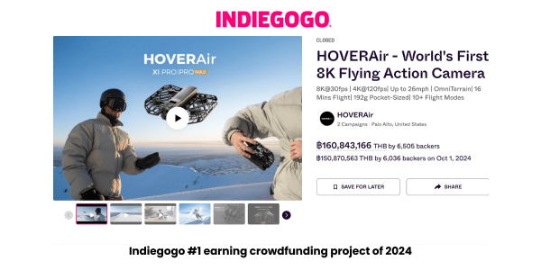 อีกทั้ง HOVERAir X1 PRO and PROMAX ยังเป็นกล้องโดรนที่ได้รับการสนับสนุนให้ขาย เป็นอันดับ 1 ใน Indiegogo ในช่วงปี 2024 นี้ ที่สำคัญ HOVERAir X1 PROMAX ไม่ใช่แค่กล้องบินธรรมดา แต่เป็นกล้องแอ็กชันที่บินได้ตัวแรกของโลกที่รองรับการถ่ายวิดีโอความละเอียด 8K เปิดตัวบนแพลตฟอร์ม Indiegogo และกลายเป็นโปรเจกต์ที่มียอดระดมทุนสูงสุดในปี 2024 บนแพลตฟอร์มนี้และได้รับการยอมรับว่าเป็นอุปกรณ์ที่ช่วยยกระดับการถ่ายวีดีโอไปอีกขั้น ด้วยขนาดเล็ก น้ำหนักเบา และเทคโนโลยีที่ใช้งานง่าย ไม่ว่าคุณจะเป็นมือใหม่หรือมืออาชีพ ก็สามารถใช้งานได้อย่างราบรื่นและสร้างสรรค์