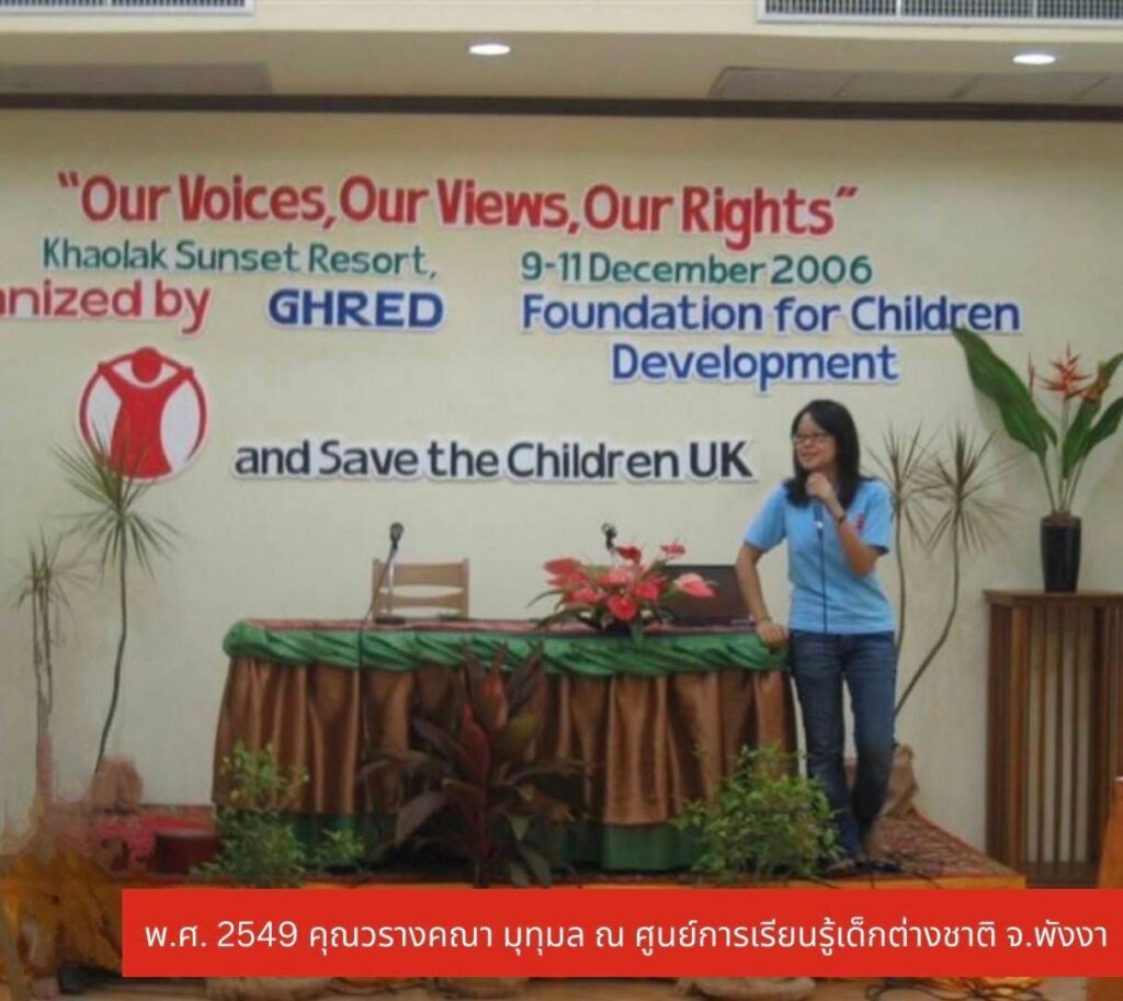คุณวรางคณา มุทุมล ผู้อำนวยการยุทธศาสตร์ คุณภาพโครงการและผลกระทบ แห่งเซฟ เดอะ ชิลเดรน ประเทศไทย คือหนึ่งในผู้ที่เริ่มต้นเส้นทางการทำงานกับองค์กรเซฟ เดอะ ชิลเดรน (ชื่อก่อนจดทะเบียนเป็น มูลนิธิช่วยเหลือเด็ก ประเทศไทย ในปัจจุบัน) ในฐานะอาสาสมัครหลังเหตุการณ์สึนามิ ได้เล่าถึงประสบการณ์ในช่วงเวลานั้นว่า “ดิฉันได้เริ่มลงพื้นที่ไปหลังจากเหตุการณ์สินามิ 6 เดือน สิ่งที่เห็นคือ เด็ก ๆ ยังคงกลัวทะเล ไม่กล้าออกจากบ้าน และผู้ปกครองก็ขอให้เราช่วยหาวิธีที่จะทำให้ลูก ๆ กลับมามีความสุขอีกครั้ง เราจึงช่วยเยียวยาและฟื้นฟูความมั่นใจเด็ก ๆ ผ่านกิจกรรมศิลปะ ดนตรี และละคร”