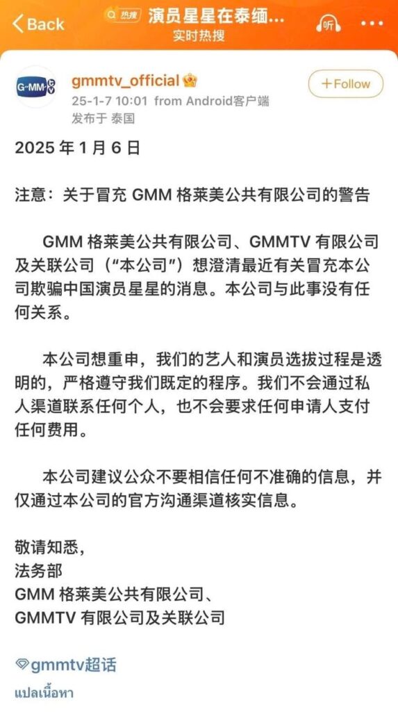 ซึ่งทางด้าน GMMTV ที่ถูกกล่าวอ้างถึง โพสต์ข้อความผ่านทางแพลตฟอร์มยอดนิยมของชาวจีน อย่าง Weibo เพื่อชี้แจง และย้ำเตือนเกี่ยวกับการแอบอ้างเป็นบริษัทจีเอ็ม เอ็มแกรมมี่ จำกัด (มหาชน) และบริษัทในเครือ โดยยืนยันว่า “การหลอกลวงดารานักแสดงชาวจีน บริษัทไม่มีส่วนเกี่ยวข้องกับเรื่องนี้”