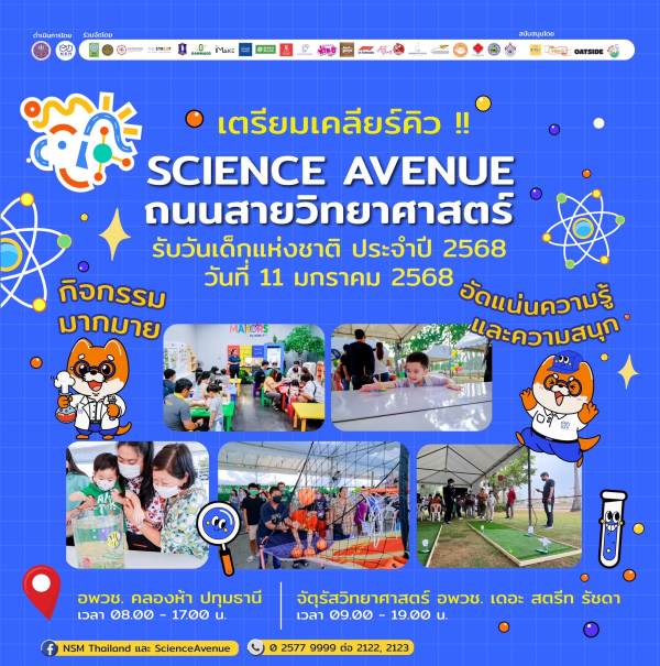 7 มกราคม 68, กรุงเทพมหานคร : องค์การพิพิธภัณฑ์วิทยาศาสตร์แห่งชาติ (อพวช.) ร่วมกับหน่วยงานภาครัฐและเอกชนจัดกิจกรรมด้านวิทยาศาสตร์และเทคโนโลยี “ถนนสายวิทยาศาสตร์ รับวันเด็กแห่งชาติ 2568” ภายใต้แนวคิด “Little Scientists’ Lab ห้องทดลองแสนสนุกของนักวิทยาศาสตร์ตัวน้อย” เพื่อเสริมสร้างประสบการณ์ และความตระหนักด้านวิทยาศาสตร์ พร้อมส่งเสริมการเรียนรู้ให้กับเด็กไทย ได้ทำกิจกรรมสื่อสัมผัสด้วยตนเอง (Hands on Experience) รวมทั้งเพื่อกระตุ้นให้เยาวชนเกิดกระบวนการคิดแบบวิทยาศาสตร์ แก้ปัญหาอย่างมีเหตุผล ดังคำขวัญ “วันเด็กแห่งชาติ” ปี 2568 จากนายกรัฐมนตรี น.ส. แพทองธาร ชินวัตร มอบไว้ว่า “ทุกโอกาสคือการเรียนรู้ พร้อมปรับตัวสู่อนาคตที่เลือกเอง” โดยงาน “ถนนสายวิทยาศาสตร์ รับวันเด็กแห่งชาติ 2568” จะจัดขึ้นในวันที่ 11 มกราคม 2568 ทั้ง 2 แห่ง ได้แก่ องค์การพิพิธภัณฑ์วิทยาศาสตร์แห่งชาติ (อพวช.) คลองห้า ปทุมธานี เวลา 08:00-17:00 น. และ ศูนย์การค้า เดอะ สตรีท รัชดา ชั้น 5 กรุงเทพฯ 09:00-19:00 น. สามารถเข้าร่วมฟรี! ไม่มีค่าใช้จ่าย ติดตามรายละเอียดเพิ่มเติมไต้ที่ เฟซบุ๊ก: ถนนสายวิทยาศาสตร์ ScienceAvenue หรือ www.nsm.or.th สอบถามรายละเอียดเพิ่มเติม โทร. 02-577-9999 ต่อ 1791