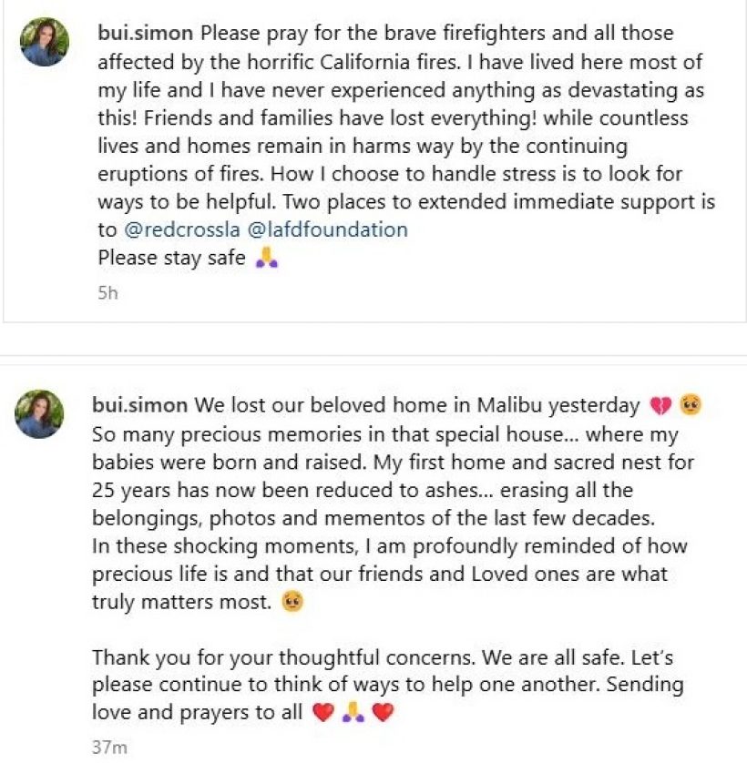 โดย ปุ๋ย ภรณ์ทิพย์ ได้เผยข้อความสุดเศร้าไว้ประมาณว่า “เมื่อวานนี้เราสูญเสียบ้านอันเป็นที่รักในมาลิบู ความทรงจำอันล้ำค่ามากมายในบ้านพิเศษหลังนั้น… ที่ซึ่งลูก ๆ ของฉันเกิดและเติบโต บ้านหลังแรก และรังศักดิ์สิทธิ์ของฉันตลอด 25 ปี ตอนนี้กลายเป็นเถ้าถ่าน… ทุกอย่างถูกลบไปหมด ทั้งข้าวของ รูปถ่าย และของที่ระลึกทั้งหมดในช่วงสองสามทศวรรษที่ผ่านมา”