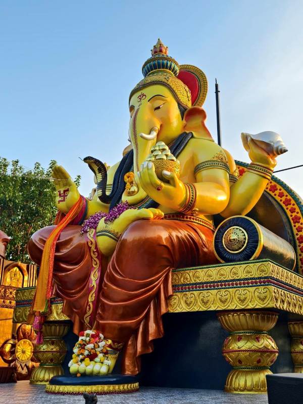 บรรยากาศพิธีบวงสรวงเริ่มในช่วงเวลาประมาณ 17.00 น.ของ วันที่ 9 มกราคม 2568 โต๊ะบวงสรวงจัดเต็มสวยงาม งานนี้ อาจารย์เบ โอมมาศ์ตรา ได้ประกอบพิธีบวงสรวงพร้อมกับพราห์มและอาจารย์ท่านอื่น ๆ ที่ประจำอยู่ที่เทวาลัย ไฮไลท์ของงานนี้คือนักร้องสาวมาขับร้องเปิดตัวเพลง “ประสิทธิเม พิฆเนศวร” แบบสด ๆ เพื่อเป็นการมอบบทเพลงถวายแด่ พระพิฆเนศ ปางมหาราชา ซึ่งถือเป็นประธานองค์เทพของเทวลัยแห่งนี้