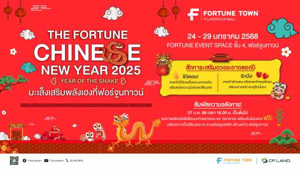 21 มกราคม 2568, กรุงเทพฯ – ฟอร์จูนทาวน์ (Fortune Town) ศูนย์รวมไอทีและไลฟ์สไตล์ชั้นนำย่าน รัชดา-พระราม 9 ภายใต้การบริหารงานของ บริษัท ซี.พี.แลนด์ จำกัด (มหาชน) หรือ CP LAND จัดฉลองเทศกาลตรุษจีน มะเส็งเสริมพลังเฮง กับงาน “The Fortune Chinese New Year 2025 Year of The Snake” ในวันที่ 24 – 29 มกราคม 2568 บริเวณ Fortune Event Space ชั้น 4 ฟอร์จูนทาวน์ รัชดา-พระราม 9