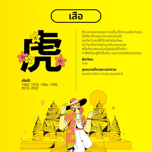คนปีขาลเกิดมาเพื่อเป็นผู้นำ กระหายความตื่นเต้น และความโอ่อ่าสง่างาม คุณเสือผู้รักความท้าทายจะมีความสุขสนุกเต็มพิกัดในเมืองที่มีสีสัน รุ่มรวยประเพณี เพียบพร้อมด้วยสถานที่พักผ่อนที่ผสานความสงบและความสมดุลเข้าด้วยกันอย่างกลมกลืนของอินโดนีเซีย เมืองยอกยาการ์ตาเป็นจุดหมายที่ลงตัวสำหรับคนปีขาลที่ต้องการเติมเต็มทั้งความตื่นเต้นเร้าใจและความสงบภายใน