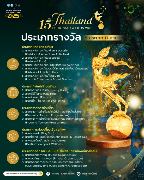 วันที่ 26 กุมภาพันธ์ 2568 การท่องเที่ยวแห่งประเทศไทย (ททท.) แถลงข่าวเปิดตัวโครงการประกวดรางวัลอุตสาหกรรมท่องเที่ยวไทย (Thailand Tourism Awards) ครั้งที่ 15 ประจำปี 2568 ก้าวสู่ 3 ทศวรรษรางวัลแห่งเกียรติยศ พร้อมประกาศเพิ่มรางวัลแห่งความยั่งยืน (Thailand Tourism Sustainability Awards) ครั้งแรก เพื่อเชิดชูผลงานที่มีความโดดเด่นด้านการบริหารจัดการความยั่งยืน โดยมีนางสาวฐาปนีย์ เกียรติไพบูลย์ ผู้ว่าการ ททท. เป็นผู้แถลงร่วมกับ ผศ. ดร. เอกก์ ภทรธนกุล ผู้แทนคณะกรรมการพิจารณาตัดสินฯ พร้อมด้วย นางวัลลภา ไตรโสรัส ประธานเจ้าหน้าที่บริหารและกรรมการผู้จัดการใหญ่ บริษัท แอสเสท เวิรด์ คอร์ป จำกัด (มหาชน) ผู้แทนผู้ได้รับรางวัลอุตสาหกรรมท่องเที่ยวไทย ครั้งที่ 14 ประจำปี 2566 ประเภทที่พักนักท่องเที่ยว และผู้บริหาร ททท. ให้เกียรติเข้าร่วมงาน ณ The Storeys Square ชั้น G ตึก The Storeys, One Bangkok กรุงเทพมหานคร เชิญชวนผู้ประกอบการท่องเที่ยวทั่วประเทศสมัครเข้าร่วมการประกวดเพื่อเฟ้นหาสุดยอด 100 ผู้ประกอบการท่องเที่ยวไทยที่มีคุณภาพและมีมาตรฐานการบริการที่ยอดเยี่ยม เปิดรับสมัครแล้วตั้งแต่วันที่ 28 กุมภาพันธ์ – 30 เมษายน 2568 นี้