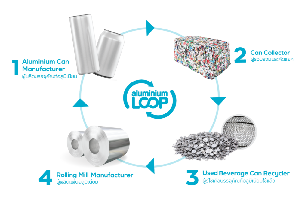 ขณะที่กระบวนการรีไซเคิลบรรจุภัณฑ์อลูมิเนียมแบบครบวงจร ปัจจุบันในภูมิภาคเอเชีย มีเพียง 4 ประเทศที่สามารถดำเนินการได้ โดยประเทศไทยเป็นหนึ่งในประเทศที่มีศักยภาพที่โดดเด่น เนื่องจากมีโครงสร้างพื้นฐานที่เอื้ออำนวยสำหรับการรีไซเคิลแบบวงจรปิด อีกทั้งยังมีการสร้างความร่วมมือจากพันธมิตรรายสำคัญที่ช่วยให้โครงการ Aluminium Loop มุ่งสู่ การบรรลุเป้าหมายในการสร้างสรรค์ขับเคลื่อนและขยายวงจรการรีไซเคิลบรรจุภัณฑ์อลูมิเนียมที่ยั่งยืนที่สุดในโลก ได้แก่