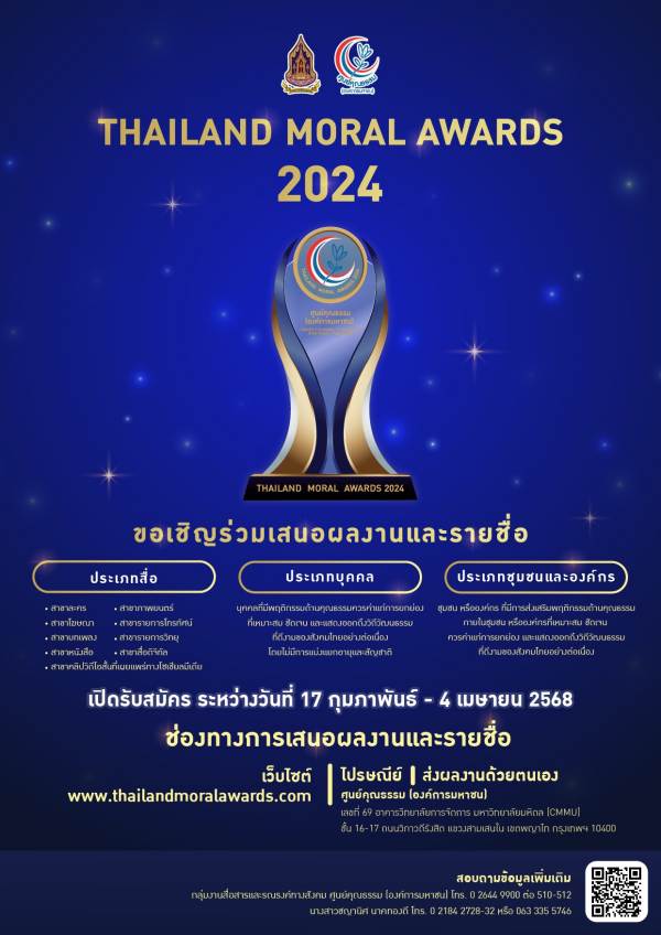 ศูนย์คุณธรรม เชิญชวนสื่อ บุคคล ชุมชนและองค์กร ส่งผลงาน “THAILAND MORAL AWARDS 2024”