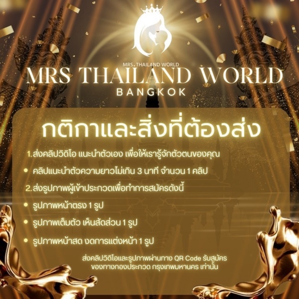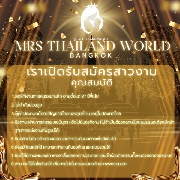 Mrs. Thailand World เปิดเวทีการประกวดที่ยิ่งใหญ่ เชิญชวนสาวสวยที่สมรสแล้วจากทั่วประเทศร่วมชิงชัยอีกครั้ง กรุงเทพมหานครไม่รอช้า ชวนสาวสวยที่เปี่ยมพลังและความมั่นใจ เข้าร่วมประกวดเป็นตัวแทนกรุงเทพมหานคร