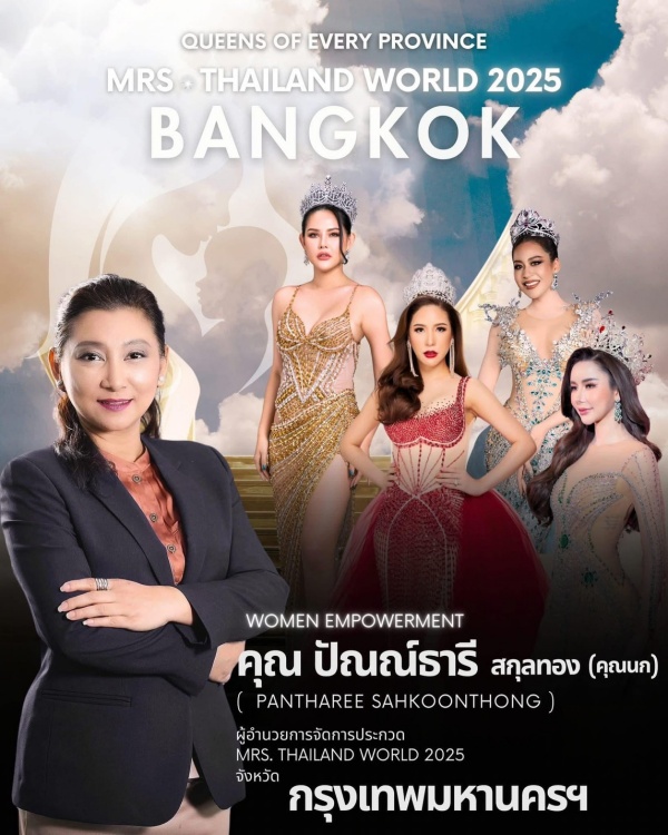 คุณปัณณ์ธารี สกุลทอง (คุณนก) บริษัทซันเดย์ครีเอชั่นส์ ผู้ถือลิขสิทธิ์ระดับจังหวัด Provincial Directors (PD) ” จังหวัด กรุงเทพมหานครฯ ” Mrs. Thailand World Bangkok ประกาศเชิญชวนผู้หญิงที่สมรสแล้ว ที่มีทั้งความสง่างาม และเปี่ยมไปด้วยพลังแห่งความรัก “Power of Love” เพื่อเป็นตัวแทนผู้เข้าประกวดระดับจังหวัดไปชิงมงใหญ่ Mrs.Thailand World 2025 และก้าวไปสู่เวที Mrs. World 2025 ที่เป็นเวทีระดับนานาชาติต่อไป