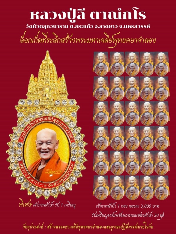 ขอเรียนเชิญพุทธศาสนิกชนทุกท่านมาร่วมบุญในครั้งนี้ เพื่อเสริมสร้างบารมี ความเป็นสิริมงคลแก่ตนเองและครอบครัว รวมถึงเป็นการสืบทอดพระพุทธศาสนาให้เจริญรุ่งเรืองสืบไป โดยผู้ร่วมทำบุญผ้าป่า 100 บาท รับ 1 เหรียญ และเจ้าภาพผ้าป่า 1 กอง ๆ ละ 3,000 บาท รับเหรียญอาร์มพร้อมภาพ และซองผ้าป่า 30 ซอง