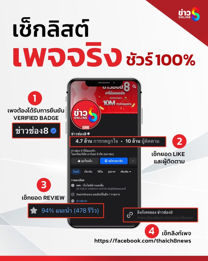 เพื่อป้องกันการสับสนและไม่ให้ประชาชนตกเป็นเหยื่อ ให้สังเกต รูปแบบของชิ้นงานเพจข่าวออนไลน์ของช่อง 8 ซึ่งขณะนี้ มีการปรับดีไซน์เป็นโลโก้ช่อง 8 แบบใหม่ และที่สำคัญ ให้สังเกตเครื่องหมายการตรวจสอบยืนยันเพจเฟซบุ๊ก (Verified Badge) โดย ต้องมีเครื่องหมายสีฟ้าด้านหลังโปรไฟล์เพจ “ข่าวช่อง 8” และมียอดผู้ติดตามจำนวน 10 ล้านคนเท่านั้น
