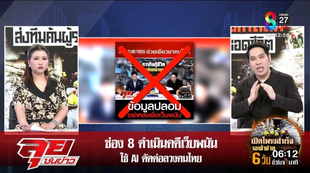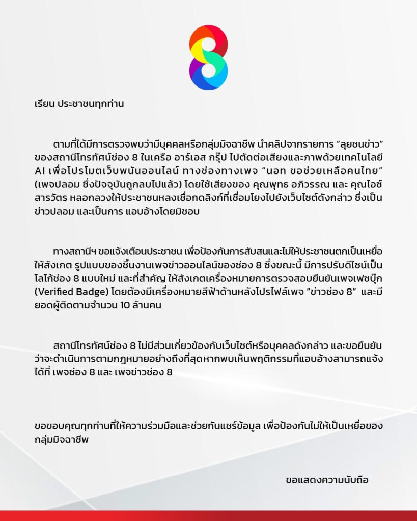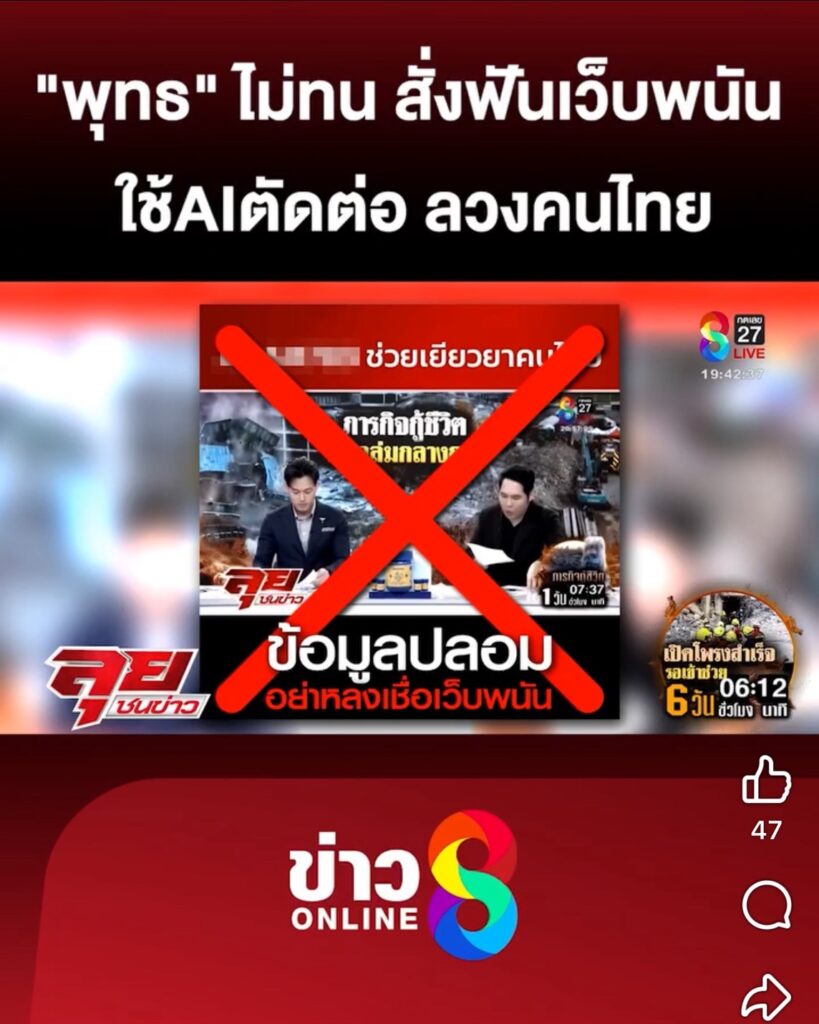 ล่าสุดมีเรื่องเตือนภัยจากผู้ประกาศข่าวชื่อดัง พุทธ อภิวรรณ และ จิตดี ศรีดี จากรายการ ลุยชนข่าว ช่อง 8 ในเครือ อาร์เอส กรุ๊ป ออกโรงเตือนประชาชน หลังพบว่ามีมิจฉาชีพนำคลิปจากรายการไป ตัดต่อและแต่งเสียงด้วย AI โดยใช้เสียงของ พุทธ อภิวรรณ และ ไอซ์ สารวัตร เพื่อหลอกลวงประชาชนให้กดลิงก์เว็บพนันออนไลน์กลโกงดังกล่าวใช้วิธี ดัดแปลงเสียงจากข่าวอื่น ให้ฟังดูเหมือนเป็นการเชิญชวนช่วยเหลือผู้ประสบภัย แต่แท้จริงแล้วกลับเป็น การชักจูงให้หลงเชื่อและกดลิงก์ไปยังแพลตฟอร์มผิดกฎหมาย ซึ่งเสี่ยงต่อการถูกดูดเงินหรือข้อมูลส่วนตัว พุทธ อภิวรรณ ย้ำเตือนกลางรายการว่า