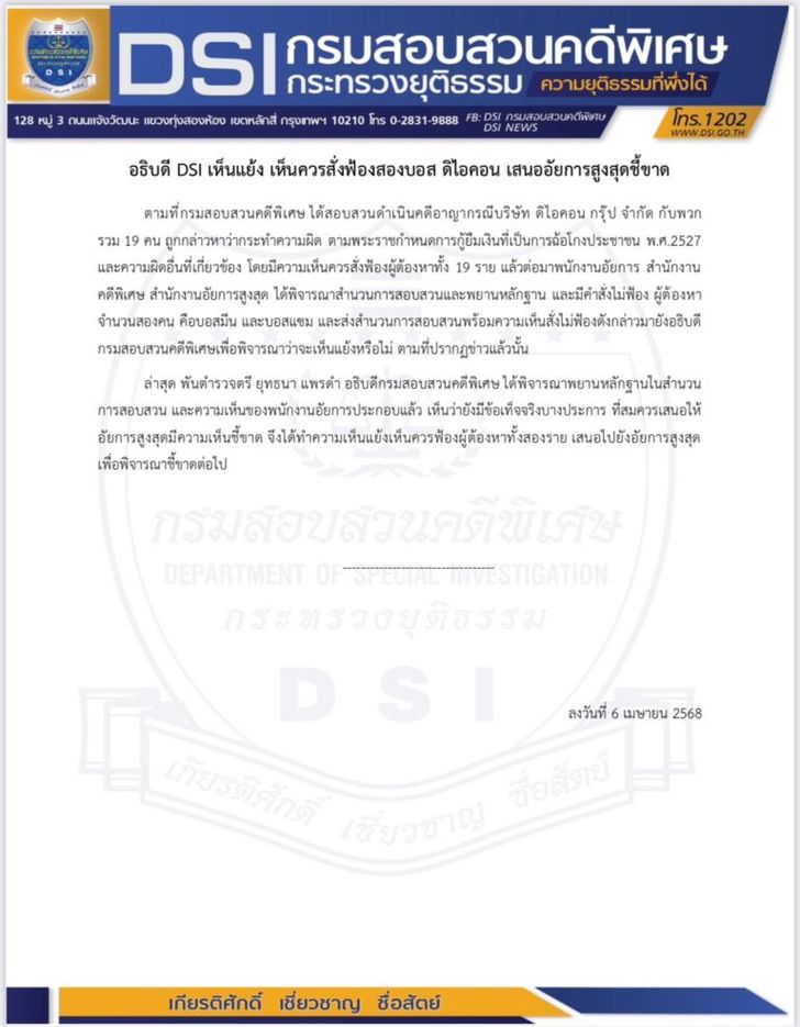 DSI เห็นแย้งควรสั่งฟ้อง 2 บอส ดิไอคอน
