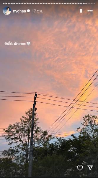 ล่าสุด “ณิชา ณัฏฐณิชา” โพสต์ภาพผ่านอินสตาแกรมสตอรี่ส่วนตัว @nychaa เป็นภาพท้องฟ้ายามเย็นสีชมพูละมุน พร้อมแคปชั่นสั้นๆ ว่า “วันนี้ท้องฟ้าสวย 🤍”