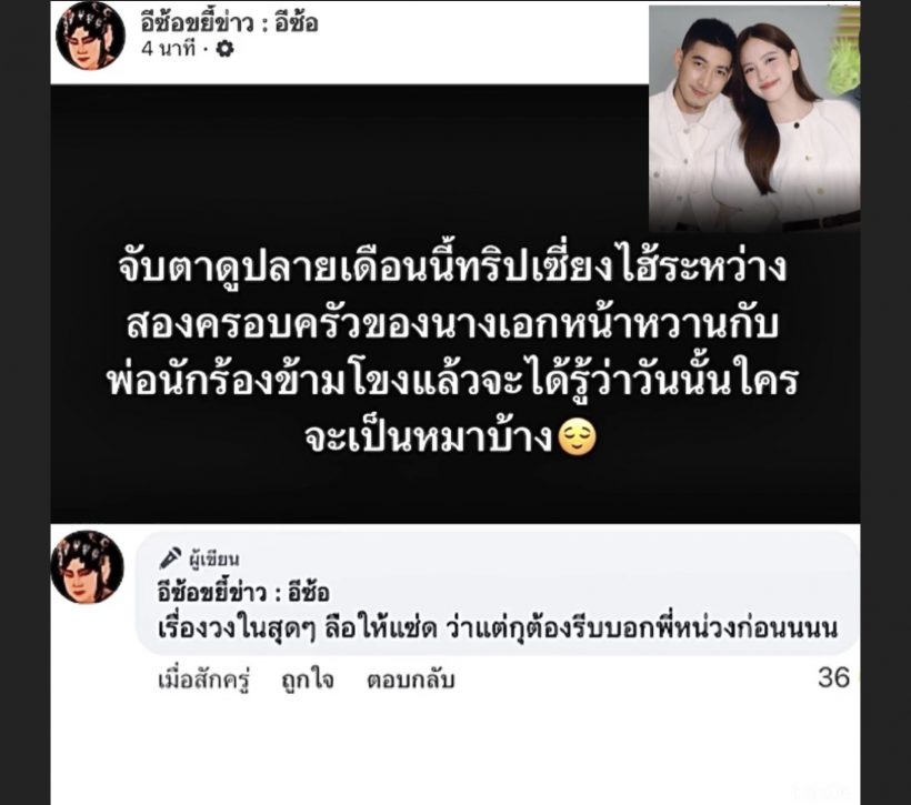 ล่าสุดทางเพจดัง อย่าง อีซ้อขยี้ข่าว ลั่นข้อความชวนคิดไว้ว่า “จับตาดูปลายเดือนนี้ทริปเซี่ยงไฮ้ระหว่างสองครอบครัวของนางเอกหน้าหวานกับพ่อนักร้องข้ามโขงแล้วจะได้รู้ว่าวันนั้นใครจะเป็นหมาบ้าง