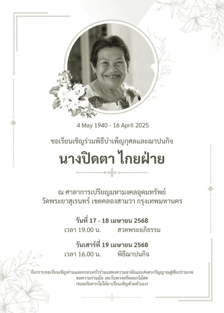 “ด้วยความอาลัยยิ่ง ขอแจ้งให้ทราบว่า คุณยายปิดตา ไกรฝ่าย ผู้เป็นที่รักของเบลล่าและครอบครัวได้จากไปอย่างสงบท่ามกลางความรักของลูกหลาน ขอเรียนแจ้งกำหนดพิธีสวดอภิธรรม ณ ศาลาการเปรียญมหามงคลอุดมทรัพย์ วัดพระยาสุเรนทร์ กราบขอบพระคุณทุกท่านที่ร่วมแสดงความอาลัยและส่งกำลังใจมาให้ครอบครัวของเรานะคะ ด้วยความรักและอาลัย”