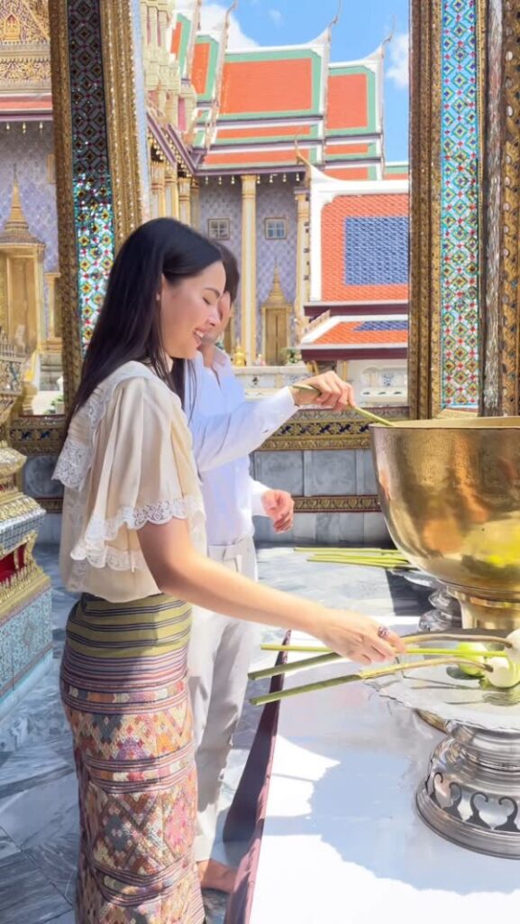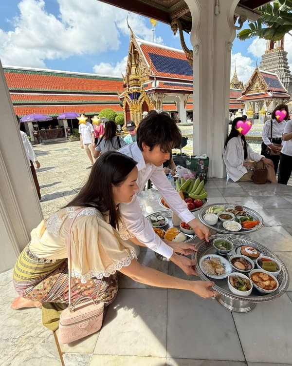 คู่รักซุปตาร์ “ณเดชน์ คูกิมิยะ” และ “ญาญ่า อุรัสยา เสปอร์บันด์” พร้อมด้วยครอบครัว ได้ร่วมทำบุญด้วยกันที่วัดกระแก้ว โดยคุณแม่แก้ว (@keaw_jung) ได้โพสต์ภาพโมเมนต์อบอุ่นผ่านอินสตาแกรม พร้อมข้อความว่า “น้อมกราบสักการะพระแก้วมรกต ถวายพานดอกบัว พวงมาลัย และภัตตราหาร ถวายร่วมกันนะคะ และสาธุร่วมกันนะคะ 🙏🙏🙏”