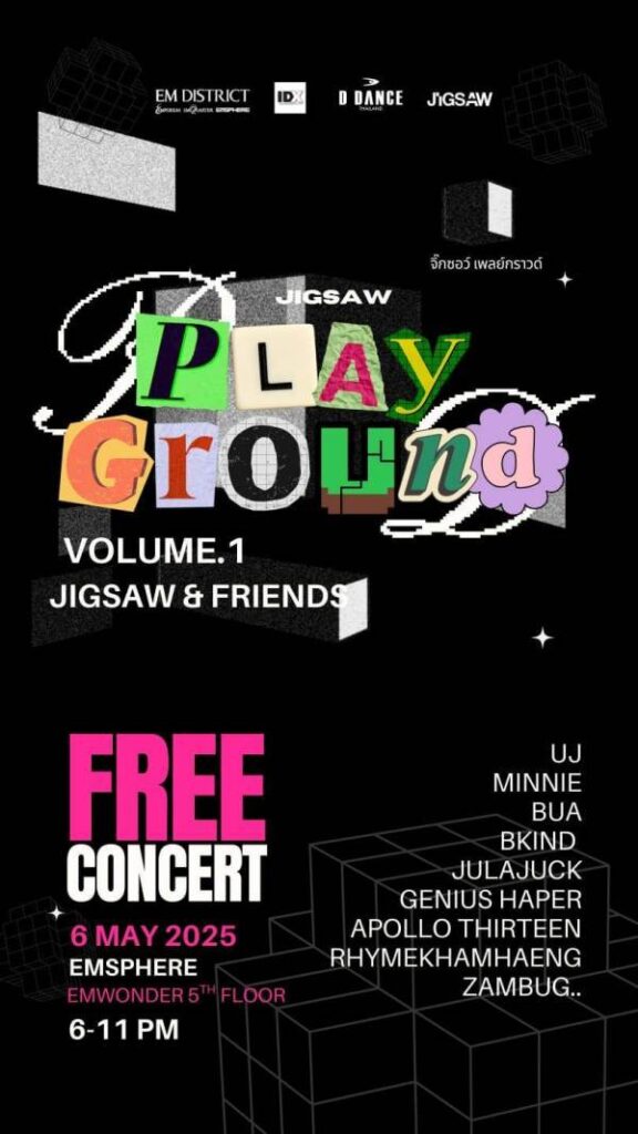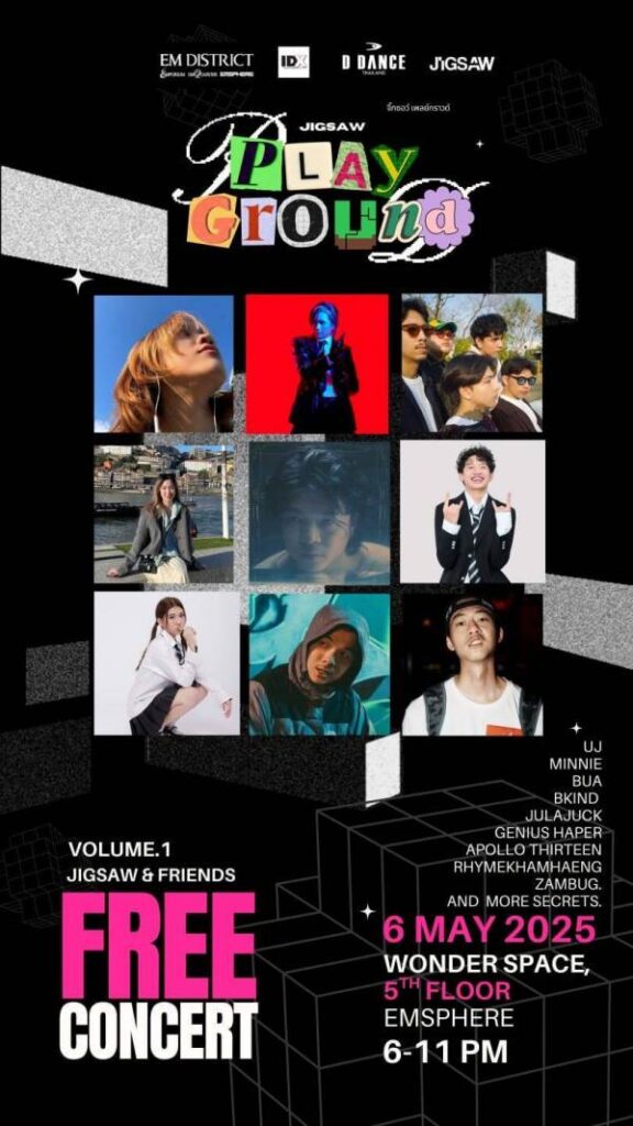 ชมโชว์สด ๆ ของ JULAJUCK และศิลปินรุ่นใหม่มากความสามารถทั้งหมดนี้ได้กับ “Music Concert : Jigsaw Play Ground” ได้ตั้งแต่เวลา 18.00-23.00 น. ที่ลาน Emwonder ชั้น 5 Emsphere งานนี้ชมฟรี!