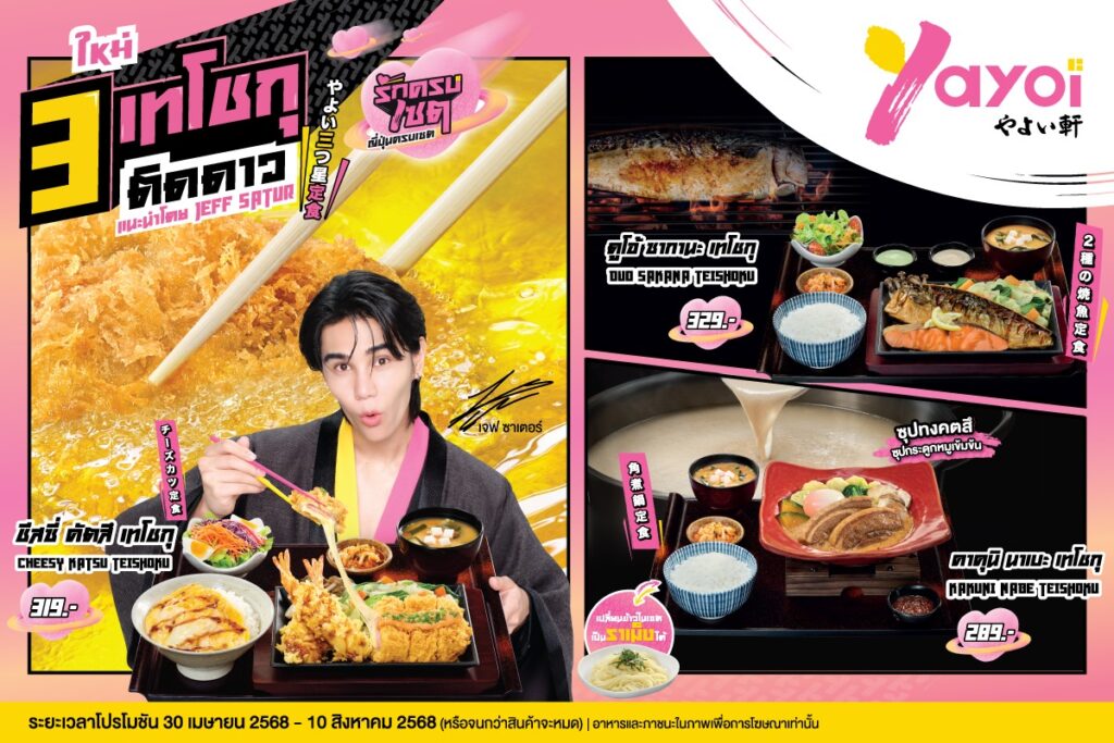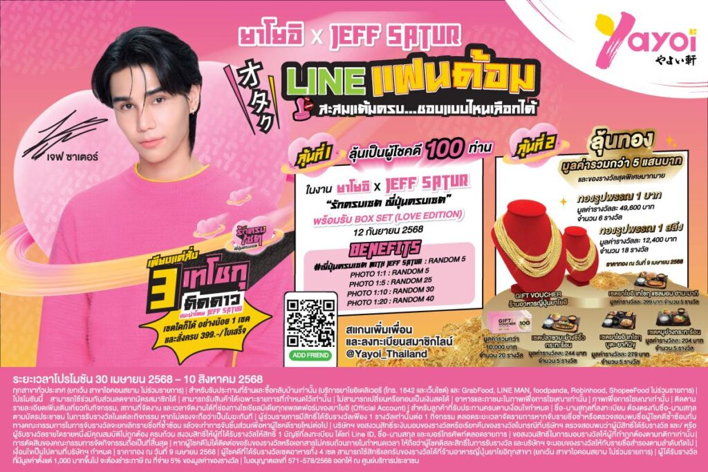 กรุงเทพฯ 30 เมษายน 2568 – “ยาโยอิ” เสิร์ฟต่อไม่หยุด จัดความสนุกครบเซตเอาใจทั้ง #เจแปนเลิฟเวอร์ และ #คุณวันเสาร์ ผ่านกิจกรรม “ยาโยอิ x เจฟ ซาเตอร์ ไลน์แฟนด้อม สะสมแต้มครบ ชอบแบบไหนเลือกได้” แค่อร่อยไปกับ เซตเมนูใหม่ “3 เทโชกุติดดาว แนะนำโดยเจฟ ซาเตอร์” รับสิทธิ์ลุ้นที่ 1 ใกล้ชิดพรีเซนเตอร์คนใหม่ “เจฟ ซาเตอร์” ในงาน “ยาโยอิ x เจฟ ซาเตอร์ รักครบเซต ญี่ปุ่นครบเซต” หรือเลือกลุ้นที่ 2 ทองคำและของรางวัลสุดปังมากถึง 164 รางวัล รวมมูลค่ากว่า 5 แสนบาท! ตั้งแต่วันนี้ – 10 สิงหาคม 2568