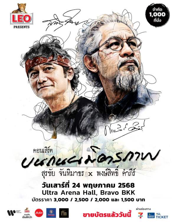 อย่าช้า! บัตรมีเหลือไม่มากแล้ว กับการเดินทางไปกับเสียงดนตรีแบบเพื่อนพ้องน้องพี่ ร่วมกับสองตำนานเพลงเพื่อชีวิต ในคอนเสิร์ต “ลีโอ พรีเซนต์ คอนเสิร์ต บนถนนมิตรภาพ สุรชัย จันทิมาธร x พงษ์สิทธิ์ คำภีร์”