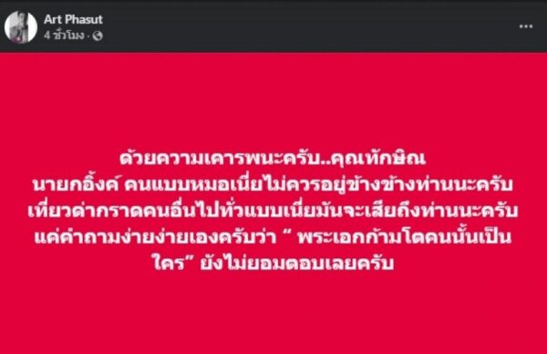 จากกรณีที่ อาร์ต พศุตม์ โพสต์ข้อความแท็กถึง นายกฯ อุ๊งอิ๊ง – แพทองธาร ชินวัตร พร้อมระบุข้อความถึง ทักษิณ ชินวัตร ไว้ประมาณว่า คนแบบหมอไม่ควรอยู่ข้าง ๆ ท่าน เที่ยวด่ากราดคนอื่นไปทั่ว จะเสียถึงท่านได้ พร้อมบอกต่อว่า อยากให้ท่านได้เห็นพฤติกรรมนี้
