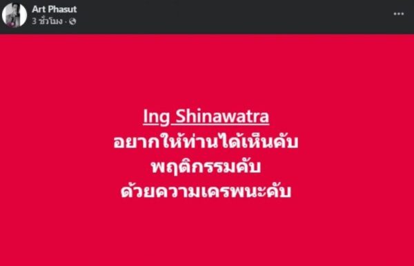ล่าสุด หนุ่มอาร์ต เคลื่อนไหวอีกครั้งโดยโพสต์ข้อความขอโทษ บอกว่า “ผม ต้อง ขอโทษท่านผู้ใหญ่ที่ผมกล่าวถึงนะครับก็คือ คุณทักษิณครับแล้วก็ นายกอิงค์ ด้วยนะที่ดึงท่านเข้ามาเกี่ยวกับเรื่องนี้นะครับยังไงต้องกราบขอโทษด้วยครับ ด้วยความเคารพ คับ Ing Shinawatra”