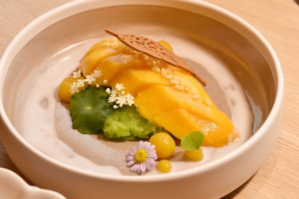 ปิดท้ายด้วยของหวานสุดคลาสสิก ข้าวเหนียวมะม่วง จับคู่กับ Kozaemon Shiroku Junmai Kabosu Sake ที่มีความเปรี้ยวสดชื่นของส้มคาโบสุ เติมเต็มมื้อพิเศษนี้ได้อย่างสมบูรณ์แบบ