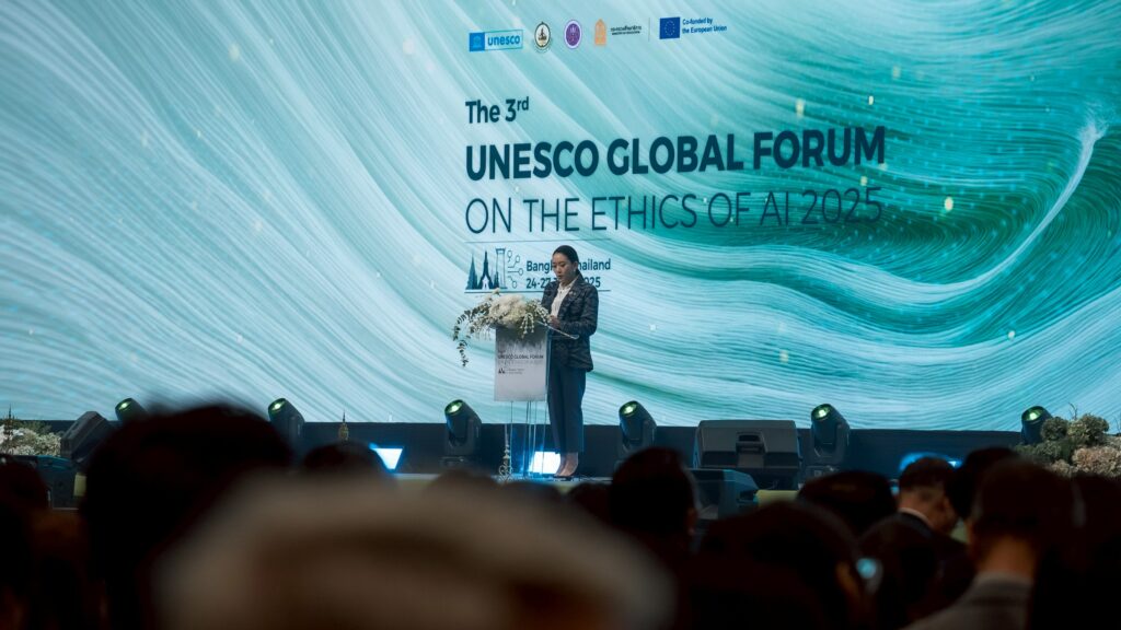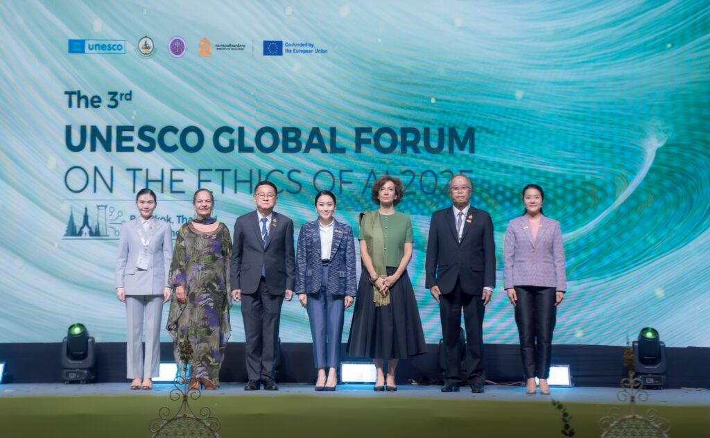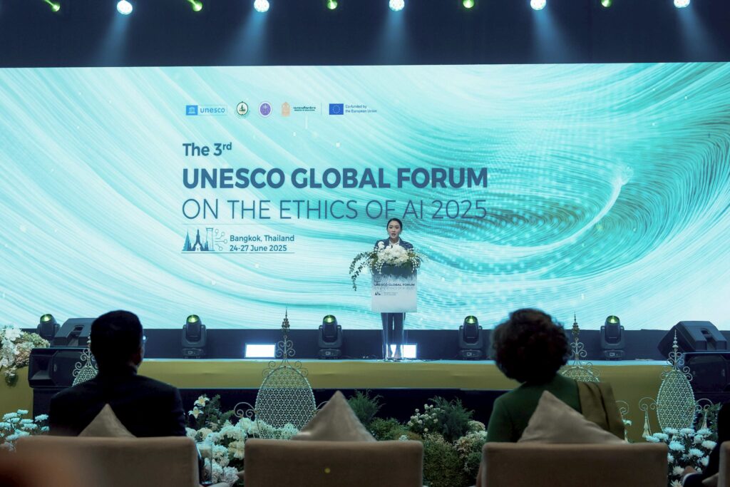 กรุงเทพฯวันที่ 25 มิถุนายน 2568-นายกฯ ‘แพทองธาร’ นำประเทศไทยในฐานะเจ้าภาพการประชุมระดับโลกภายใต้ 3 กระทรวงหลักกระทรวงดิจิทัลเพื่อเศรษฐกิจและสังคม (ดีอี), กระทรวงการอุดมศึกษาวิทยาศาสตร์วิจัยและนวัตกรรม (อว.), กระทรวงศึกษาธิการ (ศธ.) จับมือองค์การการศึกษาวิทยาศาสตร์และวัฒนธรรมแห่งสหประชาชาติ (UNESCO) เปิดการประชุมวิชาการนานาชาติ “The 3rd UNESCO Global Forum on the Ethics of AI 2025” ณโรงแรมเซ็นทาราแกรนด์เซ็นทรัลเวิลด์ระหว่างวันที่ 24–27 มิถุนายน 2568 มีผู้เข้าร่วมกว่า 104 ประเทศโดยไทยร่วมแสดงบทบาทผู้นำระดับภูมิภาคในการพัฒนา AI อย่างมีจริยธรรมพร้อมแสดงวิสัยทัศน์ว่าประเทศไทยพร้อมเดินหน้าพัฒนา AI อย่างมีธรรมาภิบาลเพื่อให้เกิดประโยชน์กับทุกคนอย่างเท่าเทียมโดยไม่ทิ้งใครไว้ข้างหลัง