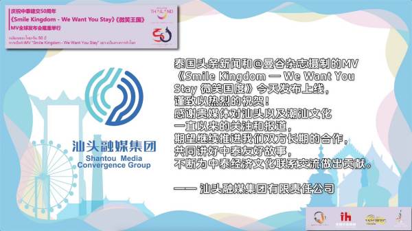บริษัทไทยเจียระไนกรุ๊ป จำกัด (มหาชน) ในฐานะกลุ่มสื่อภาษาจีนที่มีรากฐานในประเทศไทย มีบทบาทสำคัญในการเชื่อมโยงความสัมพันธ์ไทย-จีนผ่านสื่อมาโดยตลอด ตั้งแต่การผลิต MV “บทเพลงสดุดีในหลวงรัชกาลที่ 9” ฉบับภาษาจีนในปี 2017 ไปจนถึง MV “ไม่ทอดทิ้งกัน” ในปี 2020 ซึ่งรวมดารา นักการเมือง และประชาชนชาวไทยเชื้อสายจีนร่วมส่งพลังใจในช่วงวิกฤตโควิด-19 และในปี 2022 บริษัทฯ ยังได้ผลิต MV “สวัสดีค่ะ กรุงเทพฯ” เพื่อฟื้นฟูการท่องเที่ยวไทย และในปี 2025 นี้ ซึ่งตรงกับการครบรอบ 50 ปีความสัมพันธ์ไทย-จีน จึงได้สานต่อความสำเร็จ ด้วยผลงานภาคต่อในชื่อ “สวัสดีค่ะ ประเทศไทย” และผลงานล่าสุด “Smile Kingdom -We Want You Stay” MV ที่รวบรวมอารมณ์ ความทรงจำ วัฒนธรรม และมิตรภาพเอาไว้ในหนึ่งเดียว และผลงานนี้จึงถือเป็นบทเพลงแห่งการเฉลิมฉลองความสัมพันธ์อันแน่นแฟ้น และเป็นสื่อกลางที่แสดงถึงความปรารถนาในการร่วมมือกันต่อไปในอนาคตอย่างลึกซึ้งและยั่งยืน
