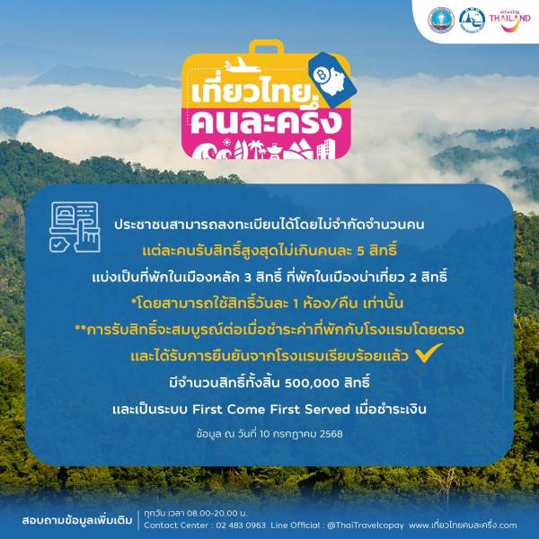 การท่องเที่ยวแห่งประเทศไทย (ททท.) แจ้งข่าวดีสำหรับผู้ที่พลาดสิทธิ์ หรือยังไม่ได้ลงทะเบียนเข้าร่วมโครงการ “เที่ยวไทย…คนละครึ่ง” โดยล่าสุดได้มีการเปิดระบบให้ลงทะเบียนอีกครั้งเป็นที่เรียบร้อยแล้ว ตั้งแต่วันที่ 10 กรกฎาคม 2568 เป็นต้นไป ผ่านทางแอปพลิเคชัน Amazing Thailand และเว็บไซต์ www.เที่ยวไทยคนละครึ่ง.com