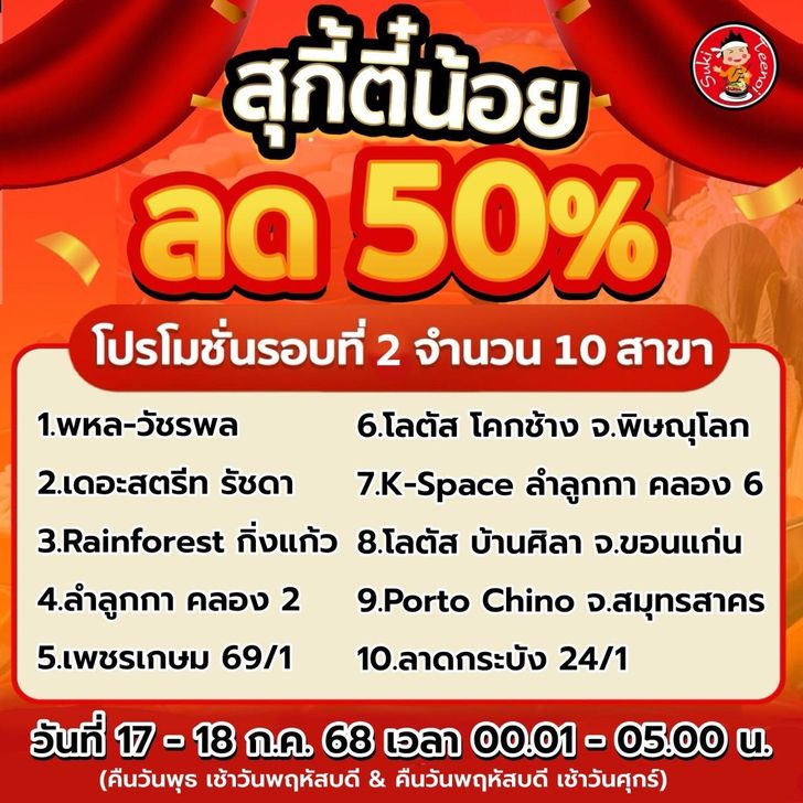 สุกี้ตี๋น้อยจัดโปรเด็ดฉลอง “บุฟเฟต์รอบดึก” ราคาสุดคุ้มเพียง 117 บาทสุทธิ (รวม VAT & เครื่องดื่มรีฟิล) เฉพาะ วันที่ 17–18 กรกฎาคม 2568 เท่านั้น! แต่มีเงื่อนไขเวลาและสาขาที่ต้องสังเกต