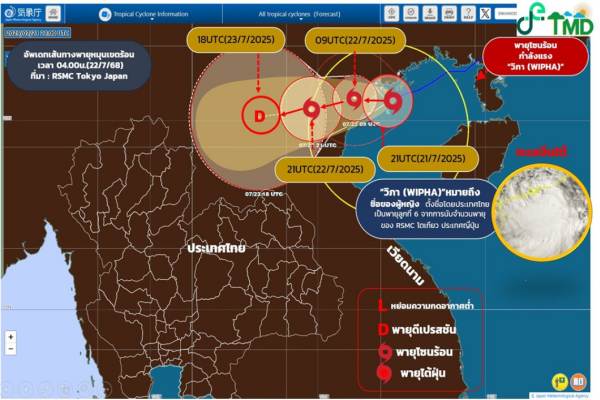 เมื่อเวลา 04.00 น. ของวันนี้ (22 ก.ค. 68) พายุโซนร้อนกำลังแรง “วิภา” บริเวณอ่าวตังเกี๋ย มีศูนย์กลางอยู่ห่างประมาณ 50 กิโลเมตร ทางตะวันออกของเมืองท้ายบิ่ญ ประเทศเวียดนาม หรือที่ละติจูด 20.5 องศาเหนือ ลองจิจูด 107.1 องศาตะวันออก มีความเร็วลมสูงสุดใกล้ศูนย์กลางประมาณ 100 กิโลเมตรต่อชั่วโมง กำลังเคลื่อนตัวทางทิศตะวันตกค่อนทางใต้เล็กน้อย ด้วยความเร็วประมาณ 15 กิโลเมตรต่อชั่วโมง คาดว่าพายุนี้จะเคลื่อนขึ้นฝั่งบริเวณเมืองท้ายบิ่ญ ประเทศเวียดนามในวันนี้ (22 ก.ค. 68) และจะอ่อนกำลังลงเป็นพายุดีเปรสชันและหย่อมความกดอากาศต่ำตามลำดับ หลังจากนั้นพายุนี้มีแนวโน้มจะเคลื่อนตัวตามแนวร่องมรสุมที่พาดผ่านประเทศลาวตอนบนและภาคเหนือตอนบนต่อไป ในขณะที่มรสุมตะวันตกเฉียงใต้กำลังแรงพัดปกคลุมทะเลอันดามัน ประเทศไทย และอ่าวไทย