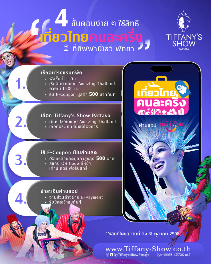 ลงทะเบียนเข้าร่วมโครงการได้ที่ www.เที่ยวไทยคนละครึ่ง.com / จองบัตรเข้าชมทิฟฟานี่โชว์ พัทยา ได้ที่ www.tiffany-show.co.th/booking/