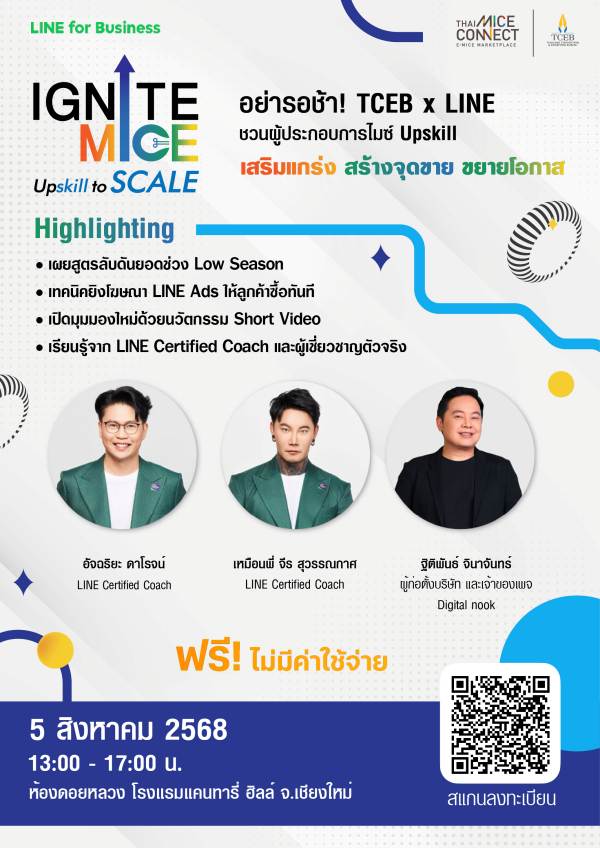 TCEB เชื่อมั่นว่า “IGNITE MICE Upskill to Scale” จะเป็นอีกหนึ่งก้าวสำคัญในการยกระดับความสามารถทางการตลาดของผู้ประกอบการไมซ์ไทยทั่วประเทศ และส่งเสริมการเติบโตของอุตสาหกรรมไมซ์ไทยอย่างมั่นคงและยั่งยืนในระยะยาว